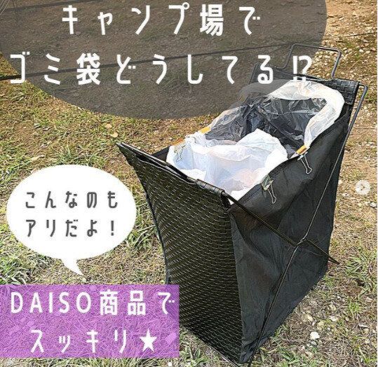 キャンプの時のゴミ箱、どうしていますか?サイトがゴミだらけだったり、ごちゃついている時になってしまいますよね。そんなときはダイソーのワイヤーバスケットが便利です。折りたたんだあとも薄いので持ち運びも楽ちん。