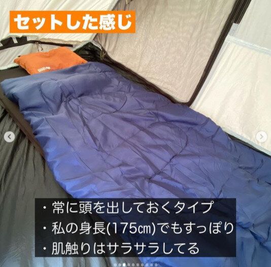 なんと、ダイソーでは寝袋も買うことができます(1,100円)。肌ざわりもサラサラしていて、インナーシュラフがあれば少し寒くても快適に寝られるそう。