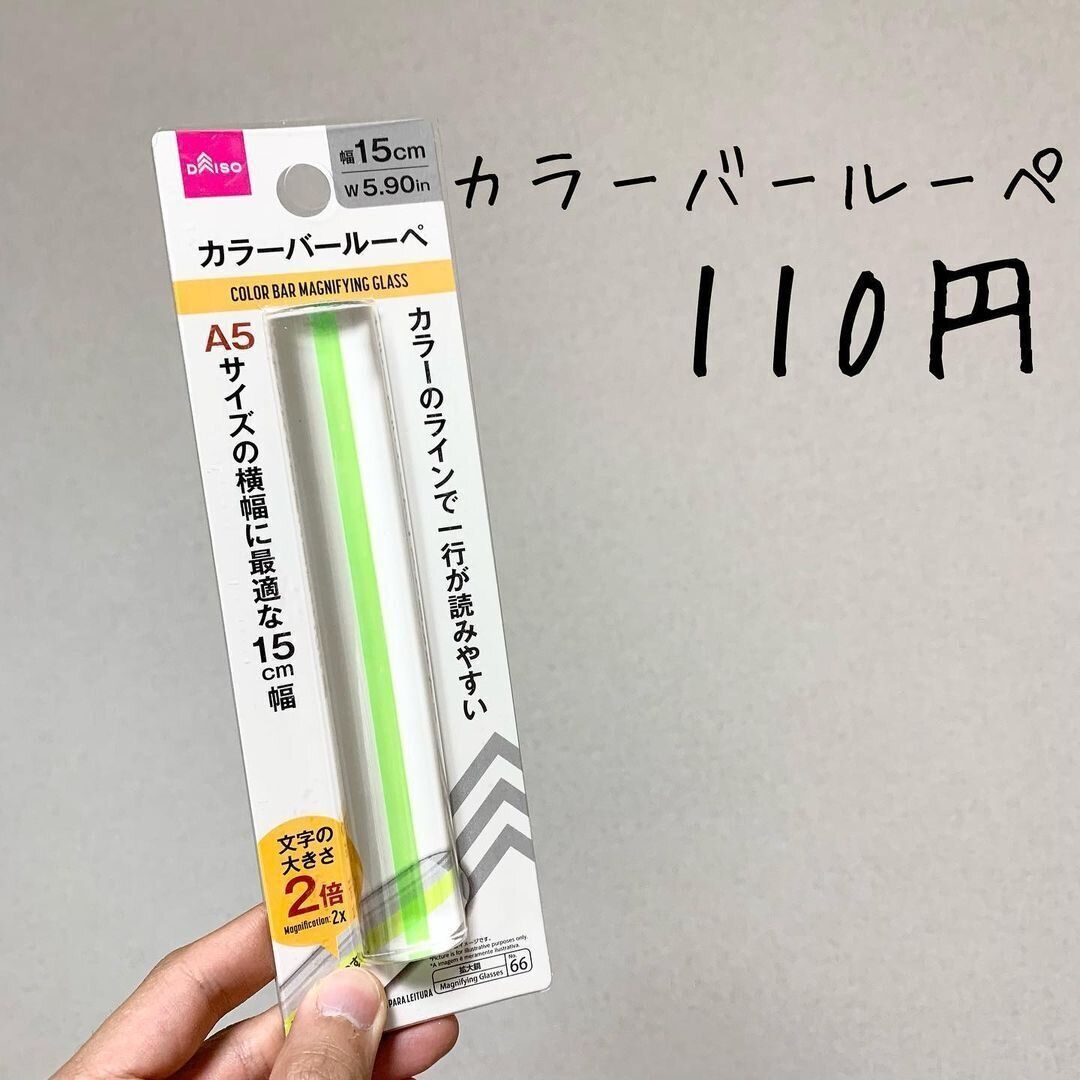 老眼とまでいかなくても小さな文字で書かれた本を読むのに苦労することは多いですよね。「いまどの行を読んでいたっけ?」とわからなくなることも。そんな悩みを解決してくれるのが、この「カラーバールーペ」。細身の拡大鏡になっているだけでなく、読んでいる行を蛍光カラーでハイライトしてくれます。