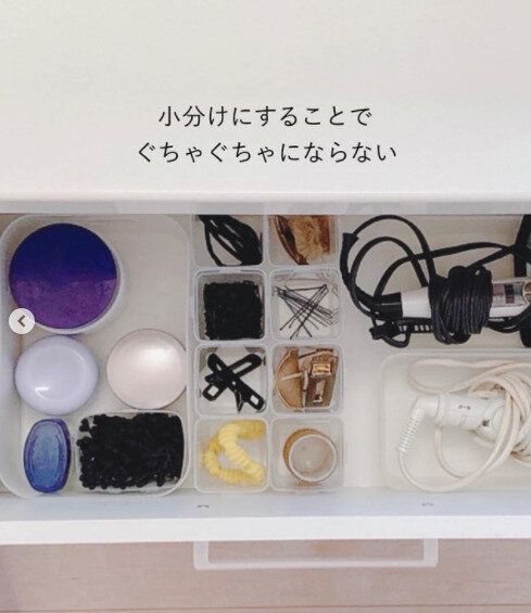 くつ下専用の収納アイテムとして巷でも人気のある「くつ下整理カップ」。今回、このカップの新たな使い方をInstagramで発見しました。洗面台の引き出しなどを、収納ボックスで仕切って使っているかたも多いと思いますが、すき間がないようにきっちりと入れないと、収納ケース自体が動いて中がぐちゃぐちゃになってしまいますよね。そこで、役立つのがこの整理カップです。カップ同士が連結できるため、引き出し内でずれることがなくなるでしょう。また、小さなヘアゴムやヘアアクセを収納するのにぴったりの大きさのため、小分けしやすく、よりすっきりとした収納を実現します。見た目以上によい仕事をしてくれるアイテムです。