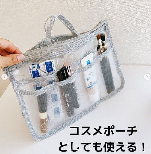 メッシュタイプのバッグインバッグは330円アイテム。バッグの中身を入れ替える手間が省けると人気のアイテム。こちらは、メッシュタイプで大小あわせて10個のポケットがついています。持ち物が多くなりがちな女性には、仕分けてしまえてとってもいいですよね。写真のように持ち運びに便利なコスメポーチとして使ったり、文房具入れにしたりしても◎。