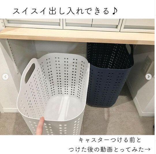 こちらは洗濯カゴの底にキャスターを取りつけたアイデア。棚の下に置かれてある洗濯カゴもスッと引き出せて便利。出し入れするときに引きずっていたストレスもあっという間に解決です。
