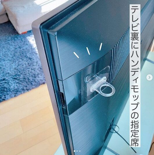 こちらは収納のプロのアイデア。貼ってはがせるフィルムフックシリーズ。リングタイプのものをテレビの裏にとりつければ、ハンディモップを収納することができます。ほこりがたまりやすいテレビ、テレビまわりもさっと取ってすぐに掃除。終われば後ろに隠して収納。これはマネしてみたい!