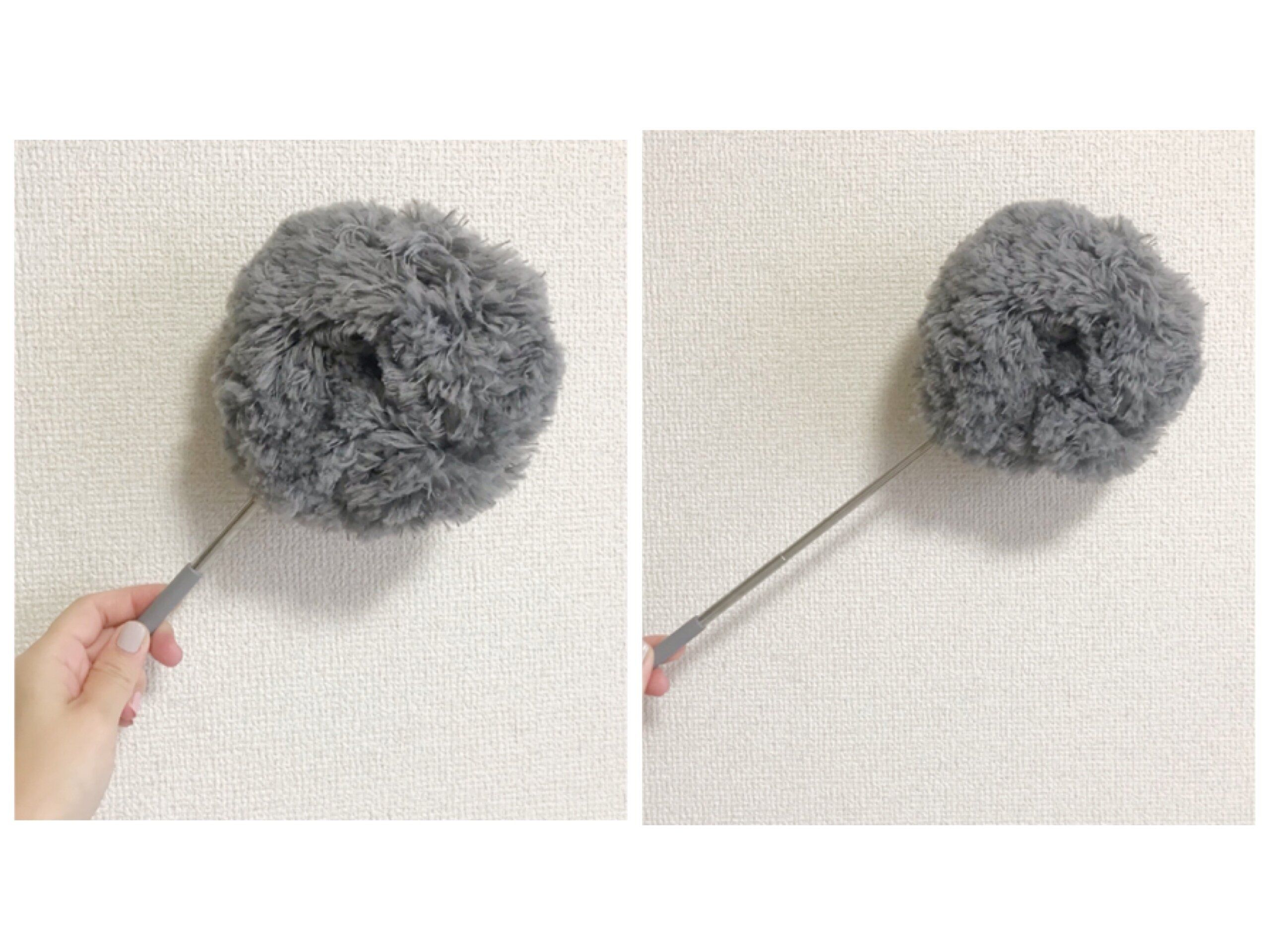 このハンディモップのお気に入りのポイントの一つが、持ち手が2段階の長さ調節が可能な点です。壁やカーテンレールなど高い部分のほこりを取りたいときは長くして使っています。