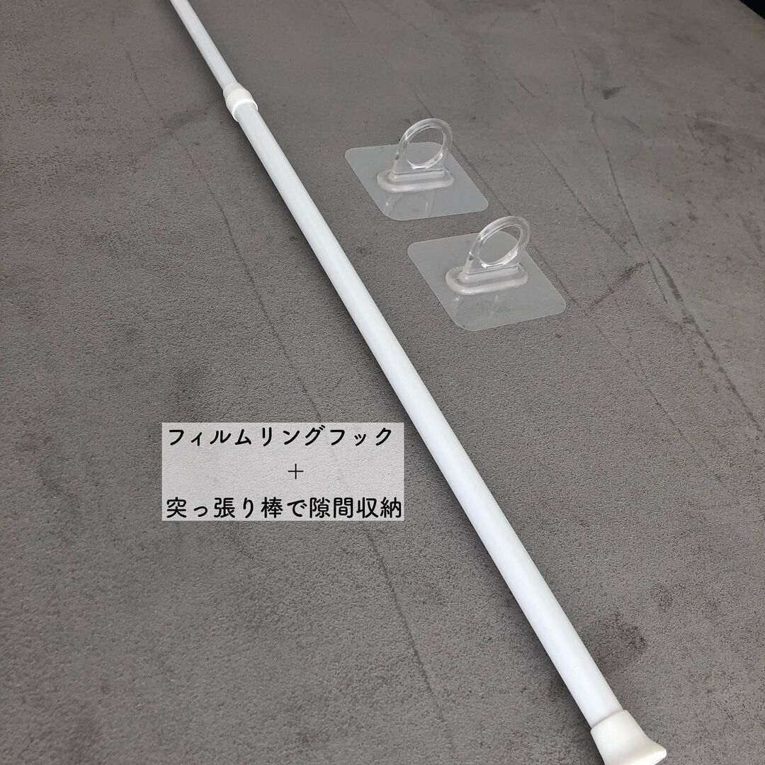 つっぱり棒だけでなく、リング状のフックを併用することで、つっぱり用スペースがない場所にも収納スペースがつくれます。フィルムリングフックは、何度でも貼ってはがせるので気軽に使うことができますね。