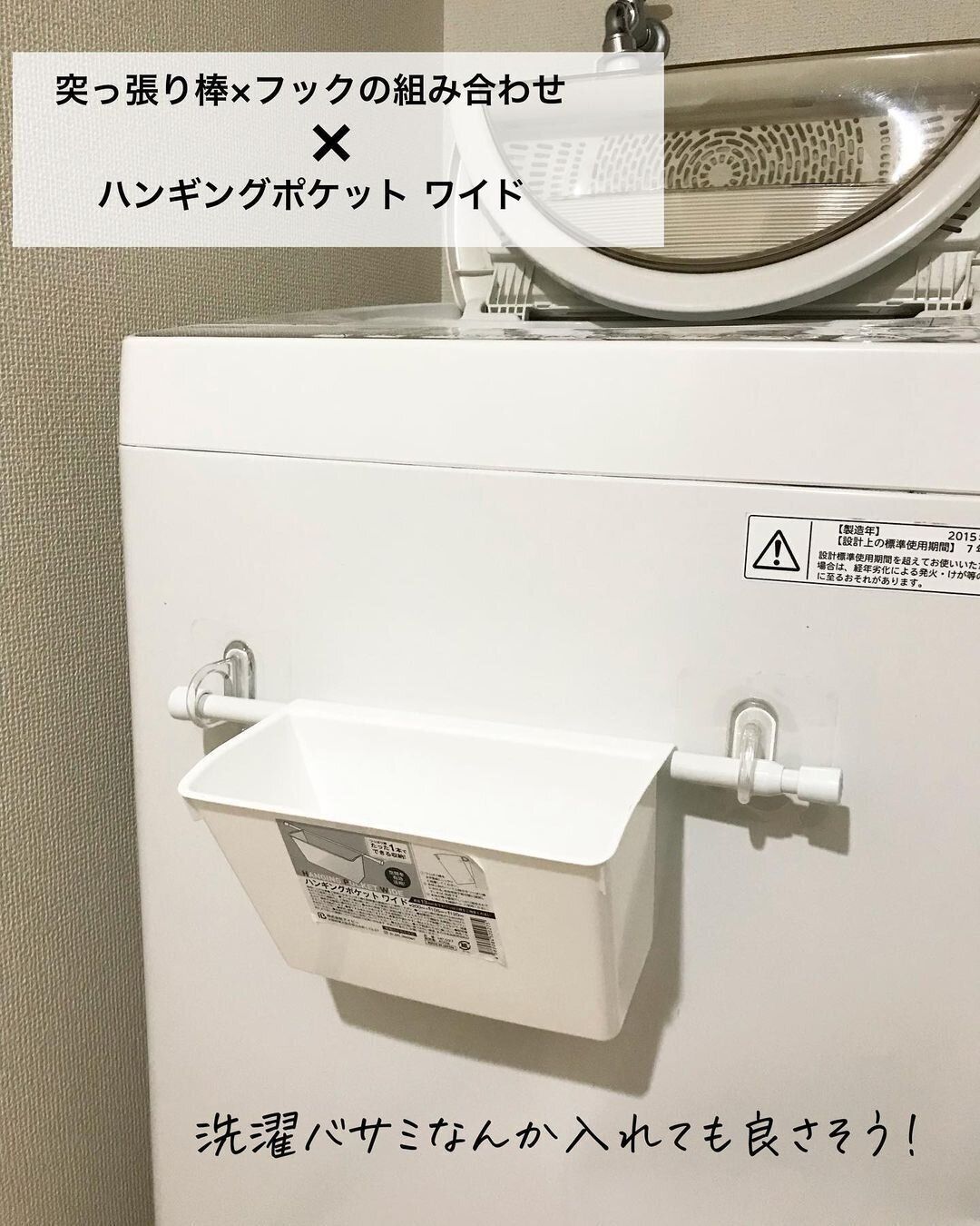 洗濯機の側面に、リング状のフックにつっぱり棒を合わせた収納スペースをつくるアイデアです。これだけでもスプレーボトルを引っかけるのに便利ですが、ほかのアイテムと組み合わせて収納力をアップさせることもできるんです。ハンギングポケットをつっぱり棒にかければ、小物収納のスペースが完成します。