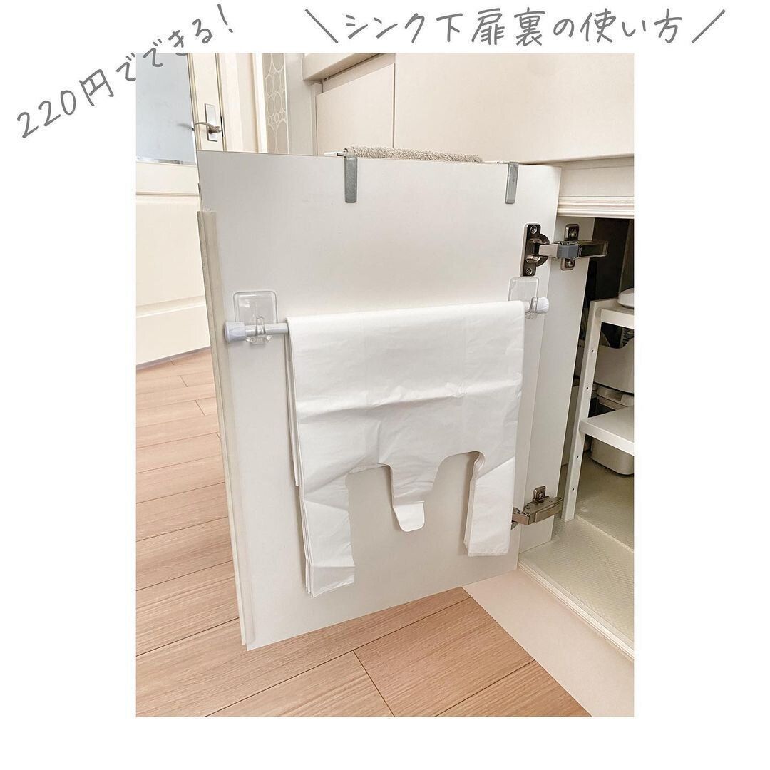 一般的なフックにつっぱり棒を合わせるアイデアも人気です。シンク下の扉裏にフックを貼りつけて、つっぱり棒をかけてビニール袋の収納スペースをつくります。ゴミ袋をかけてもよさそうですね。