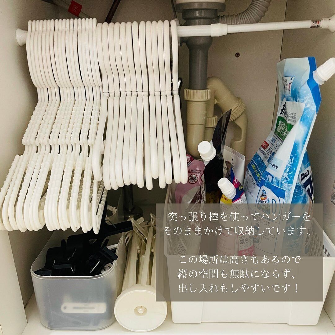 洗面所のシンク下に、洗濯に使うアイテムをまとめて収納するアイデア。ハンガーは下に置くとごちゃごちゃしがちなので、つっぱり棒にかけて収納するのがスムーズです。取り出しやすく、しまいやすい理想的な収納方法ですね。
