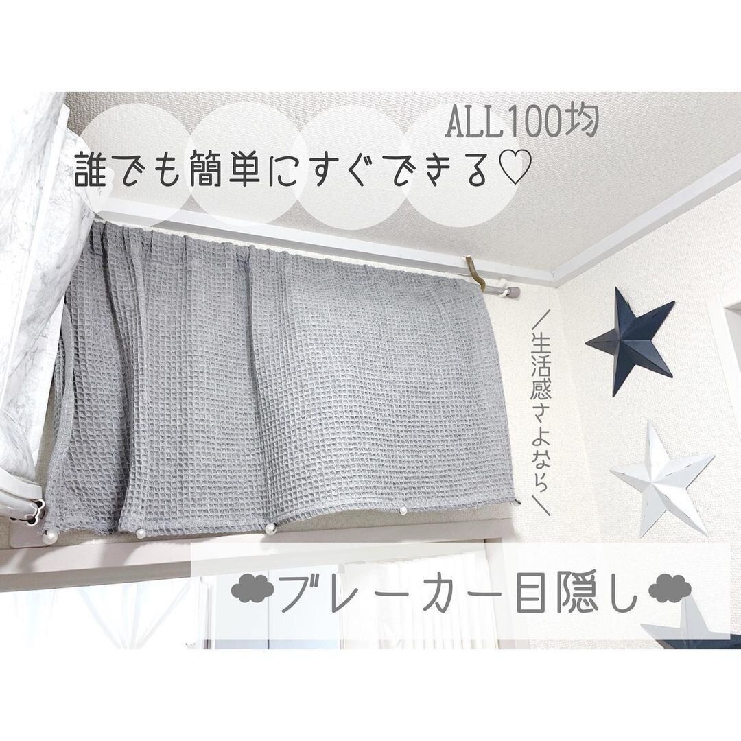 存在感のあるブレーカーがインテリアの邪魔になっているというかたにおすすめのアイデアがつっぱり棒を活用した目隠し。「穴跡が目立たないピンフック」とカフェカーテン、つっぱり棒で、簡単におしゃれな目隠しが完成します。すべて100均で購入できるのもうれしいポイントです。