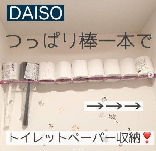 つっぱり棒1本だけでトイレットペーパー収納を作ることも可能。つっぱり棒1本をつけたら、壁に立てかけるようにトイレットペーパーを置いていくだけです。簡単で安くできる収納ですね!