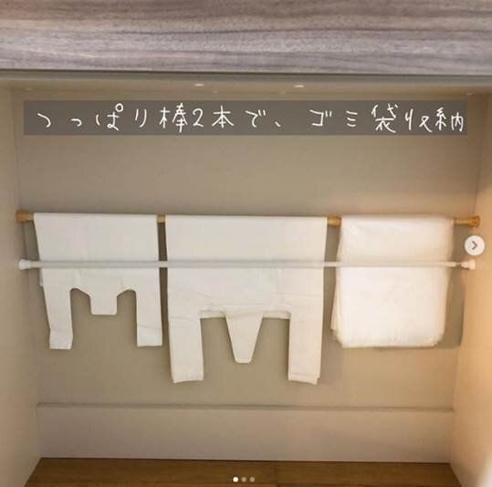 こちらはゴミ箱の後ろのスペース。この狭いすき間につっぱり棒を使ってゴミ袋を収納したアイデアです。ポイントはつっぱり棒の2本使い。こうすることでゴミ袋がプラプラせず安定します。こんな風に、使うもののすぐそばに収納すればとっても便利ですね。