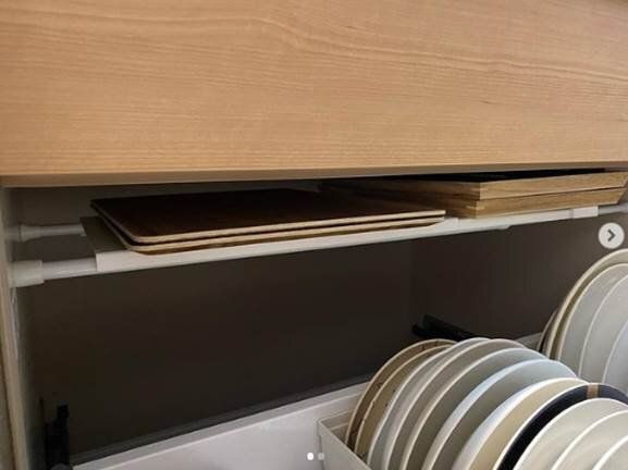 お皿を入れている引き出しの上部分。このデッドスペースにつっぱり棒を使ってお盆収納にしたアイデアです。ただ、つっぱり棒だけでは安定しないので…。
