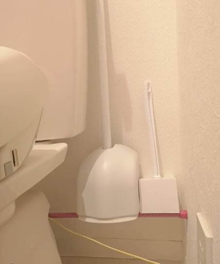 こちらはトイレ。便器の後ろに置くことも多いブラシ。床に置いてしまうと掃除が面倒なんですよね。それならば浮かせればいい!つっぱり棒を1本渡すことで浮かせる収納が完成するんです。掃除は劇的に楽になりますよね。こんなに簡単にできるなら今すぐ真似してみたい!