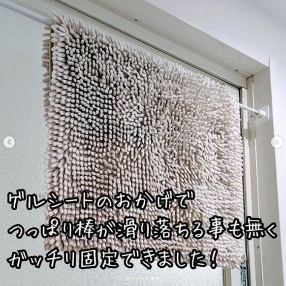 こちらはお風呂の入り口につっぱり棒を渡すことでバスマットの収納場所をつくりました。ここなら乾かすこともできて、しかも邪魔にならない。お風呂に入るときはさっと取って敷くだけ。つっぱり棒の落下を防ぐダイソーの「つっぱり棒壁面ガード」も使っているので安定感も抜群です。これは便利ですね!
