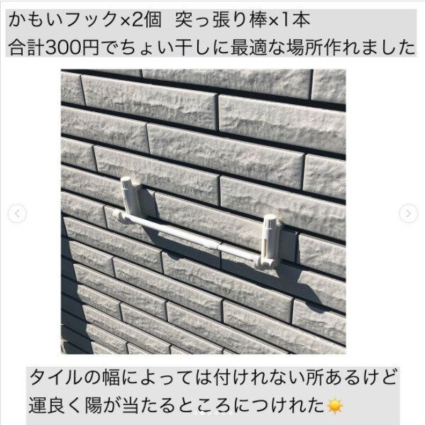 外壁のタイルの幅を利用してかもいフックとつっぱり棒でちょい干しスペースをつくるアイデアは目からウロコです。タイル幅によってはつけられない場所があったり、重たいものをかけると外壁を傷める可能性があるので要注意ですが、お手軽にちょい干しスペースがつくれるので外壁がタイルの人は試す価値ありです。