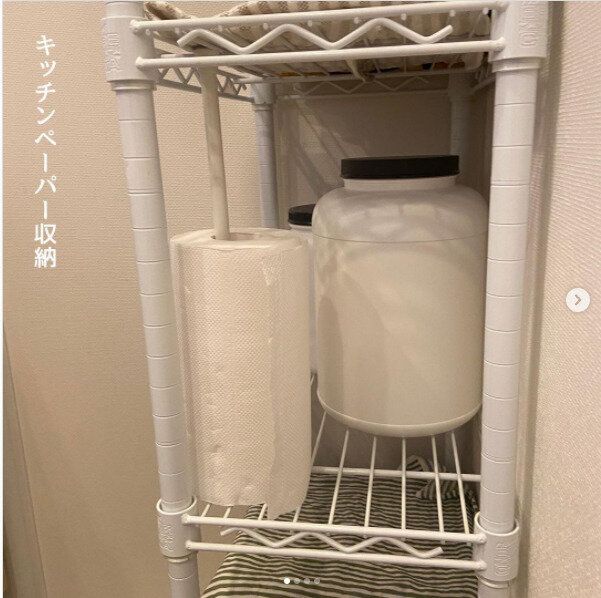 ラックにつっぱり棒を突っ張らせてキッチンペーパースタンドとして使うことでペーパーを取る際も倒れることなく簡単に引き出すことができるというアイデアです。専用のキッチンペーパースタンドを購入するより安くでき、取るたびにスタンドごとキッチンペーパーが倒れるというストレスもなくなります。