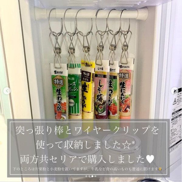 つっぱり棒とワイヤークリップを使えば、冷蔵庫内のデッドスペースにチューブ調味料を収納するスペースが簡単につくれます。すぐに倒れて置き場所に困りがちのチューブ調味料も、これならすっきりきれいに収納しておくことができます。