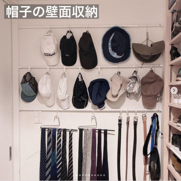 壁面につっぱり棒を使えば帽子やベルト類の収納スペースに早変わり。帽子やベルト、ネクタイなどは軽いのでつっぱり棒でも安心して収納することができます。壁面を傷つける心配がないので賃貸などで壁に穴を開けられない人でも安心です。