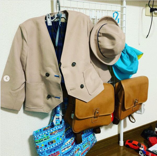 毎日使う通園アイテムもつっぱり棒とワイヤーネットを使って身支度コーナーをつくれば、まとめて収納しておくことが可能です。つっぱり棒やワイヤーネットの高さを工夫すればお子さん自身で収納できるため、毎日の身支度も自分でできるようになるかも。