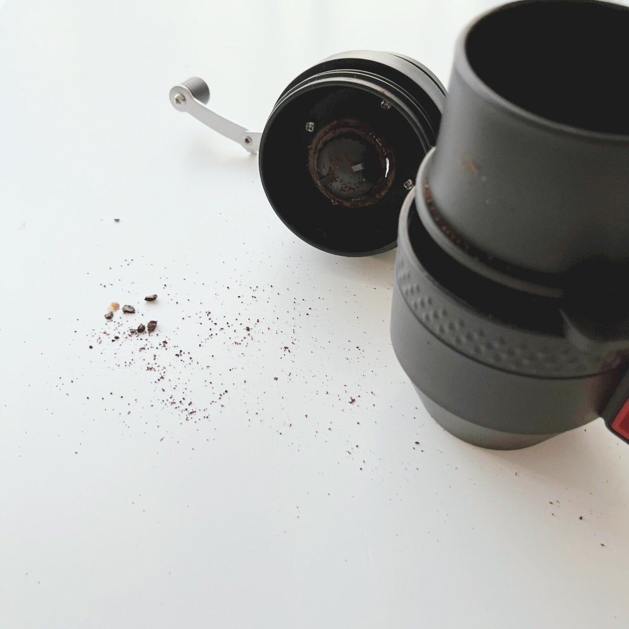 ほかのミルでも「あるある」ですが、豆を挽くときに弾け飛んだ豆の破片や、カップからミルを取り外したときは粉がこぼれます。