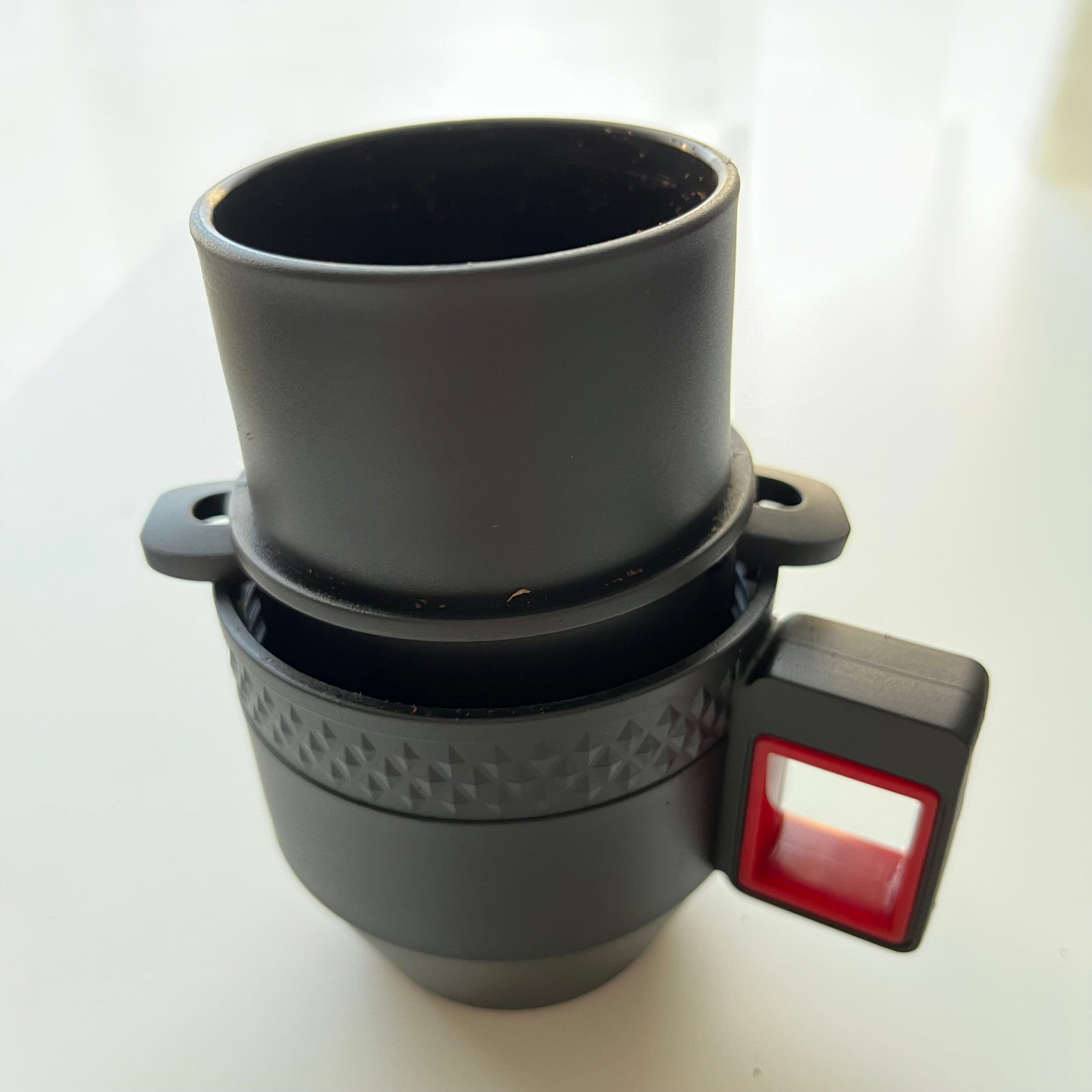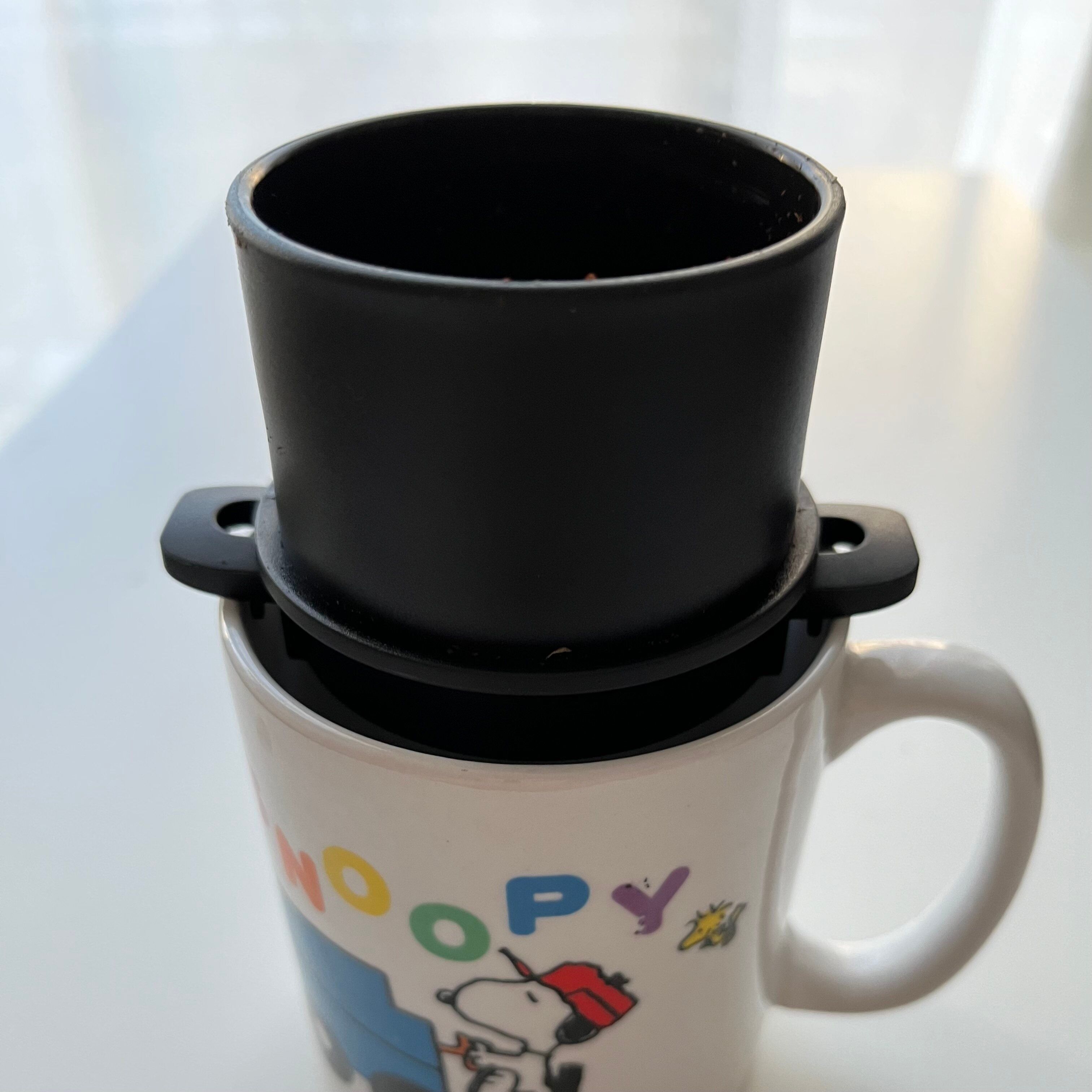 コンパクトなカップには多い分量の粉になったので、ドリッパー部分をマグカップにセットしてみたところ、なんとピッタリサイズでした!屋内で楽しむ際は、この方法もアリですね。