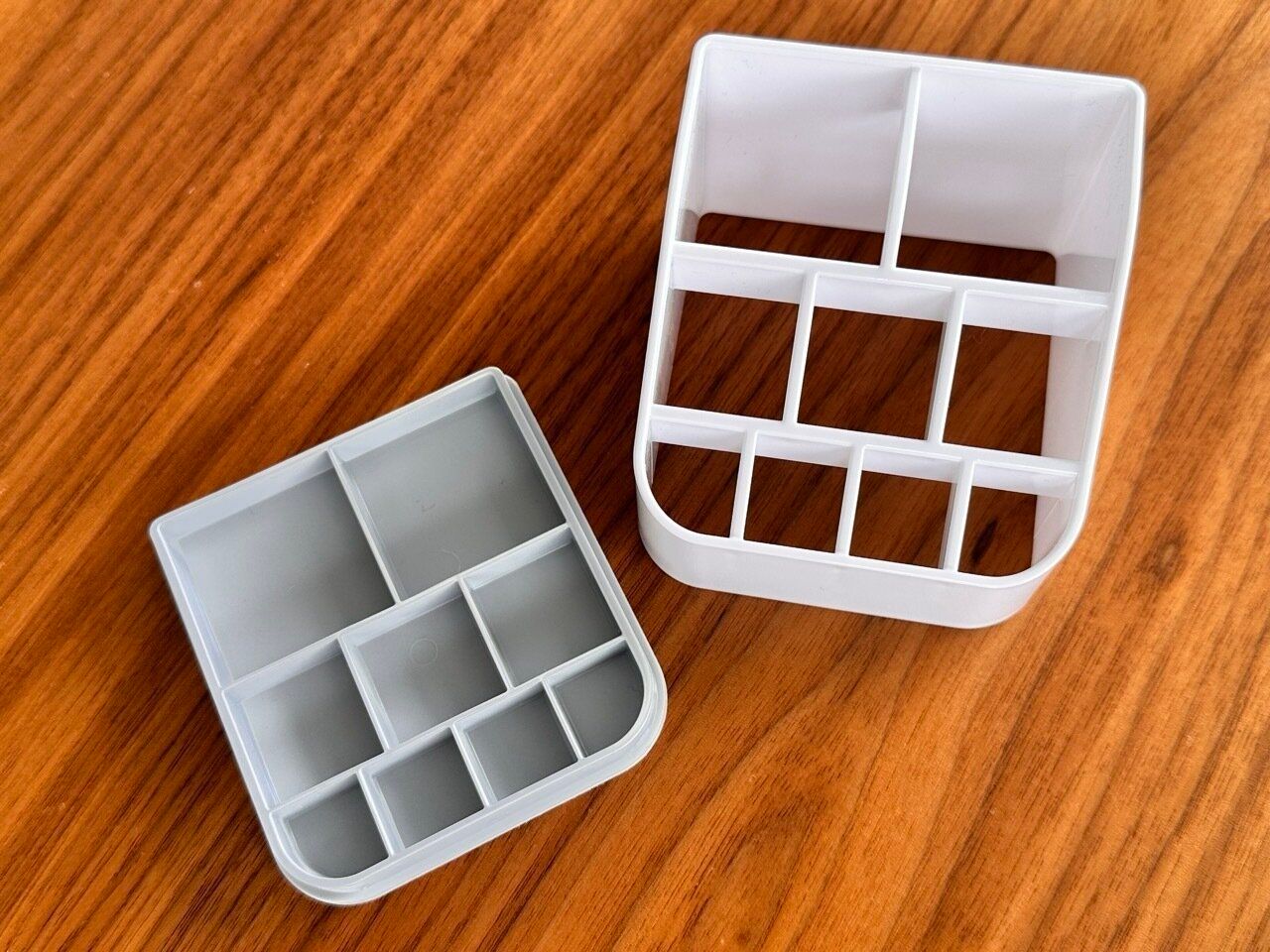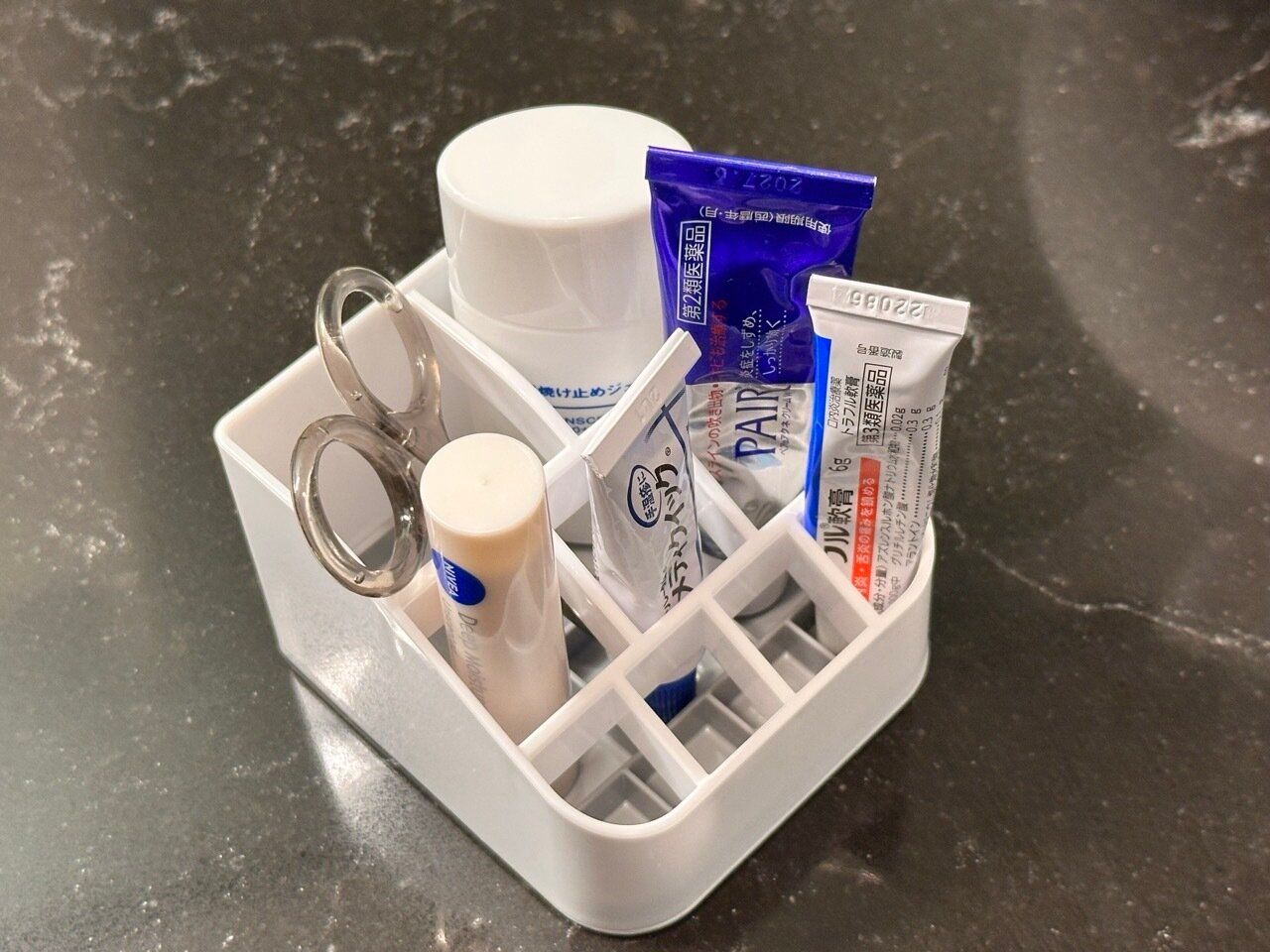 サイズ違いの仕切りが全部で9個。チューブタイプのお薬を立てて収納することができるので、使いたい時にサッと取り出すことができます。