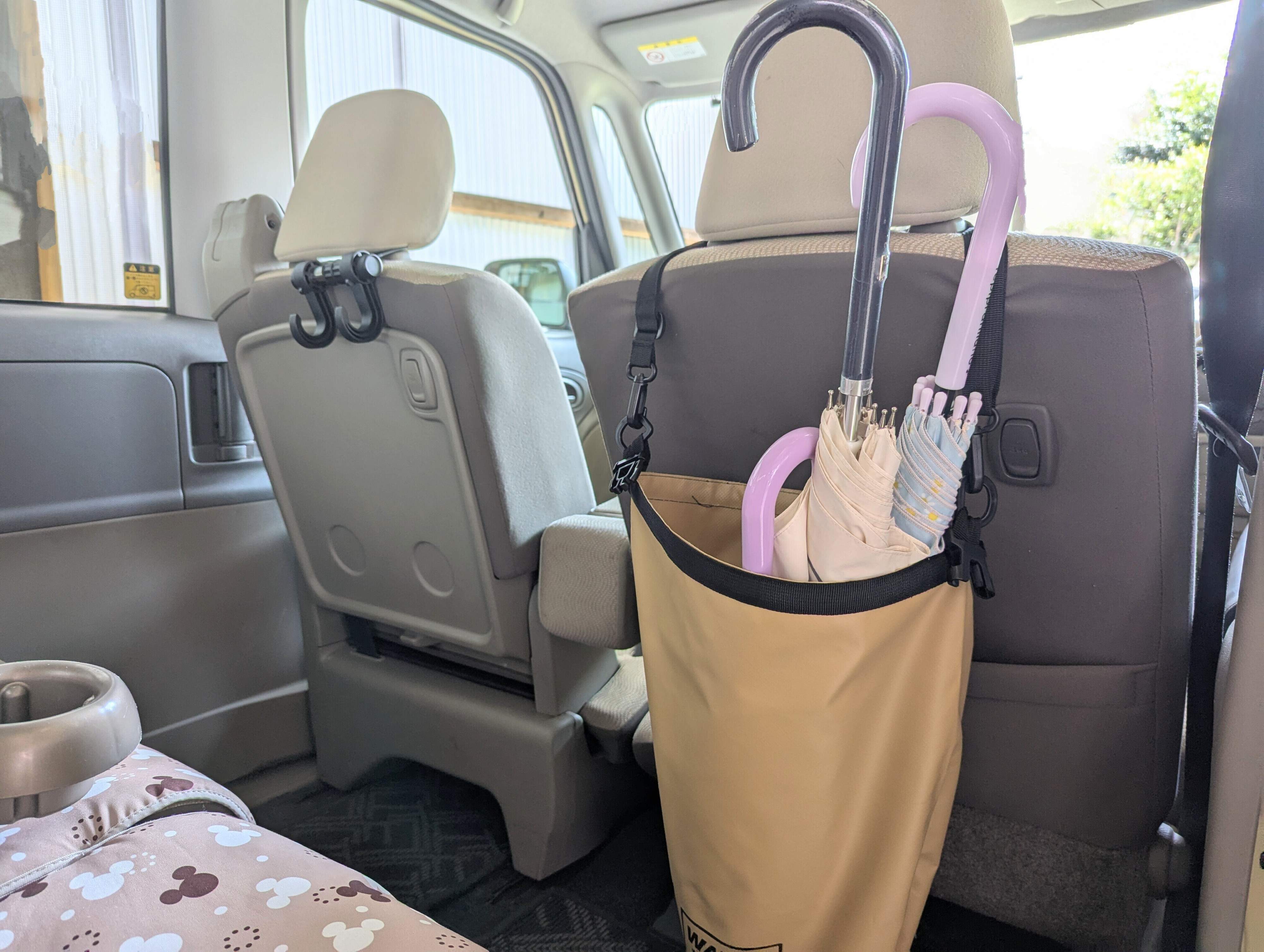 ここでも活躍するのが防水バッグ。付属のストラップを使ってヘッドレストに取りつけたら、濡れた傘を直接入れるだけ。4本程度なら余裕で入ります。筒状で口が大きく開くので、子どもでも簡単に出し入れできるのにくわえて、水を捨てたり乾かしたりといったお手入れが簡単なのもうれしいポイント。