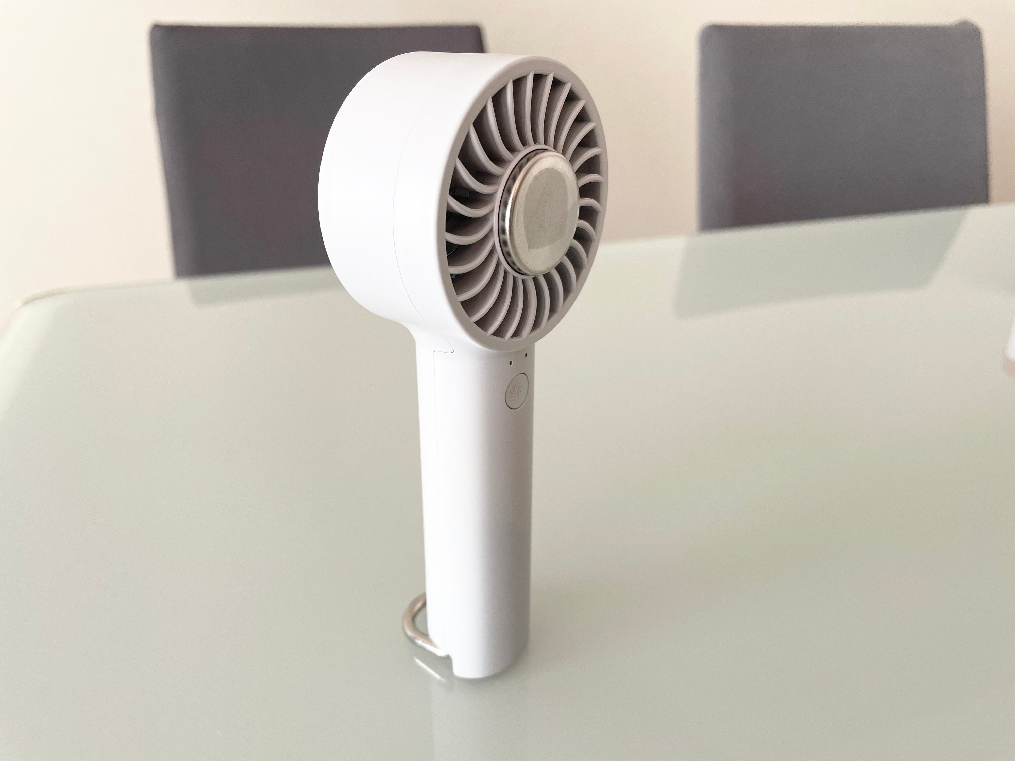 カラビナ部分を90度にすれば、本体が自立するのもうれしいポイント。握るタイプのハンディファンですが、テーブルなどに置いて使用する事も可能です。