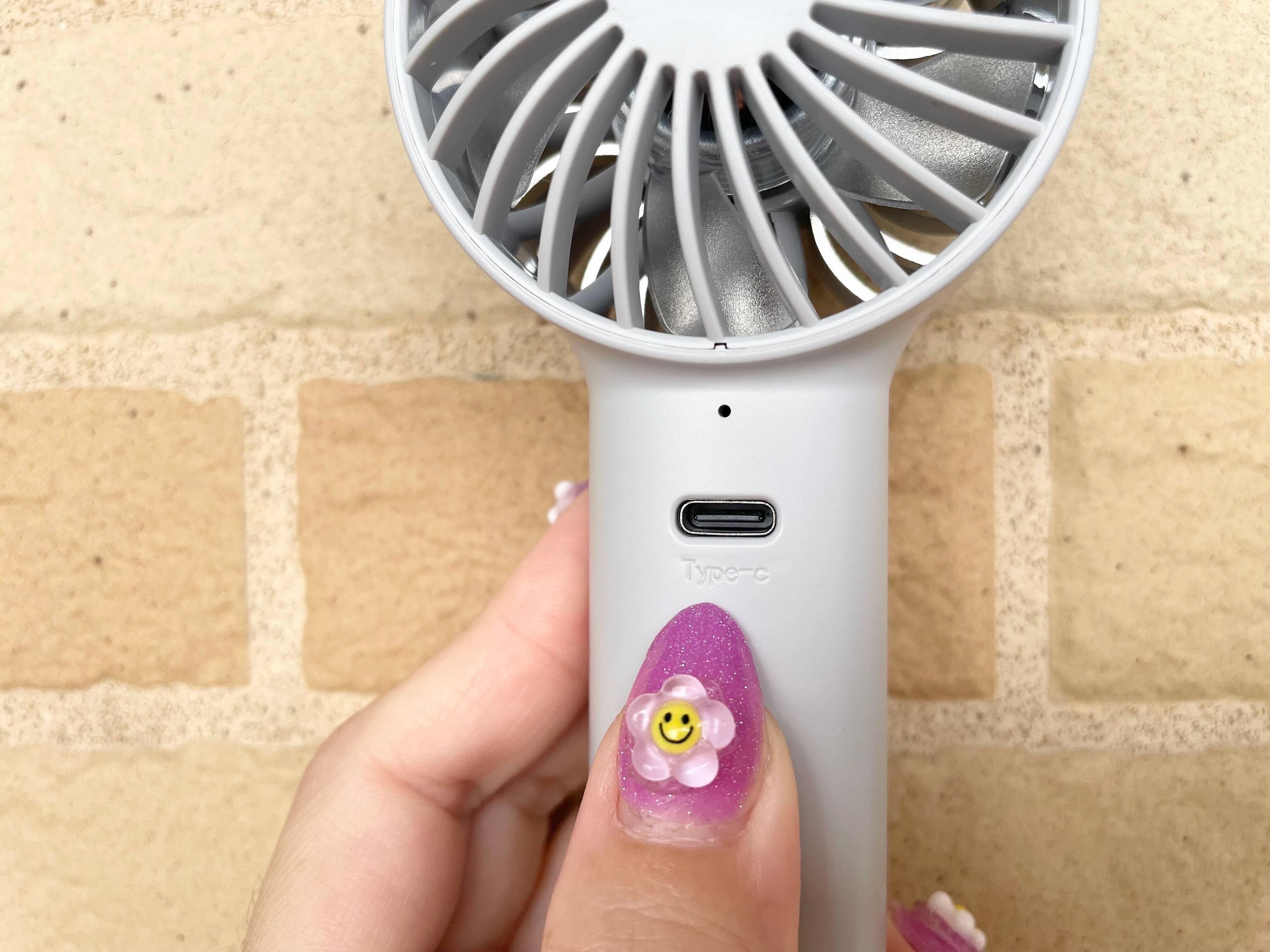 「ペルチェ付き2重構造ハンディファン」はType-Cケーブルを使用する充電式。充電ケーブル(USB Type-C)は付属していないので、自宅にあるものを使用するか、別で購入してあらかじめ用意しておく必要があるので要注意!