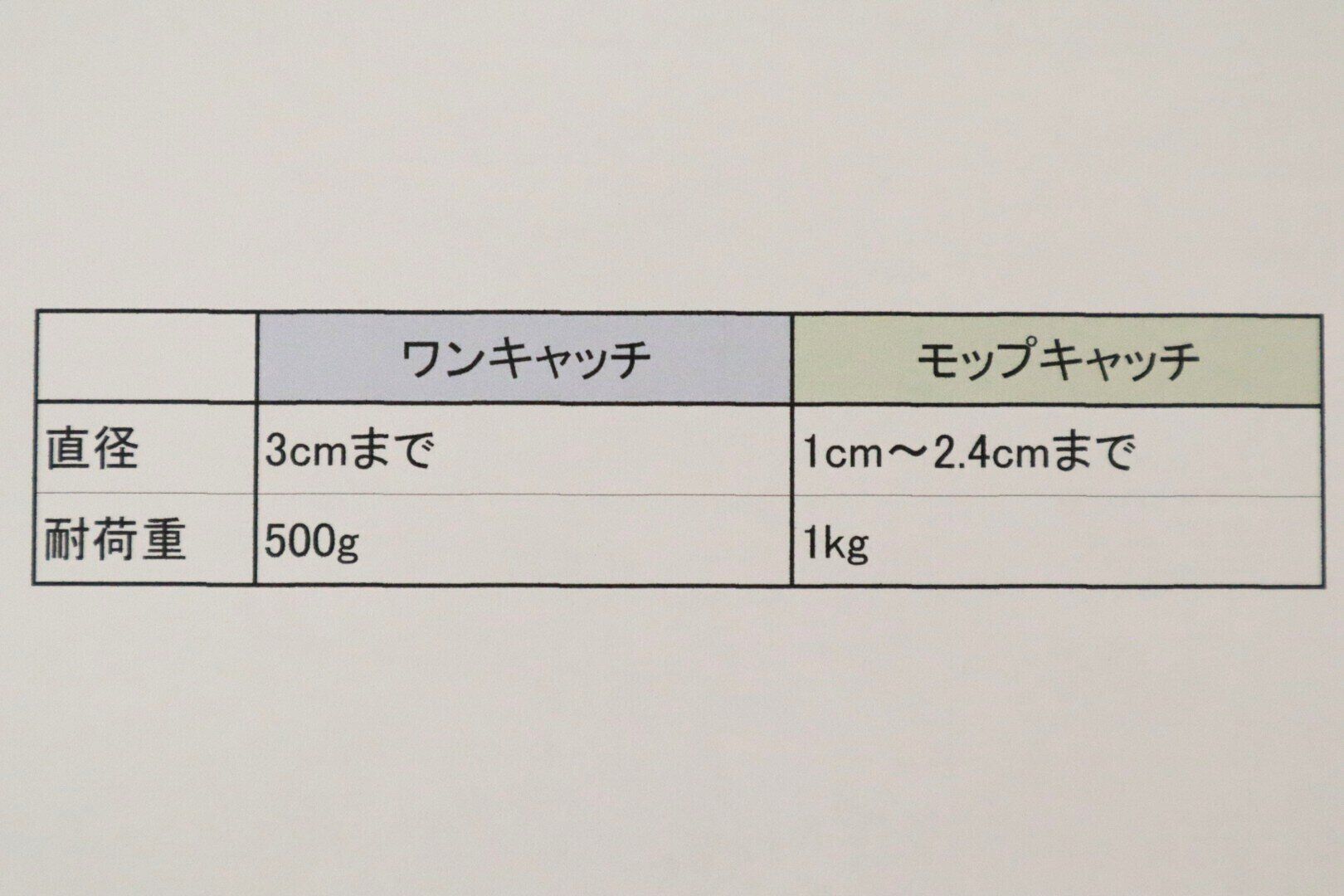 この表からおわかりになるように、ワンキャッチとモップキャッチでは耐荷重が大きく異なります。