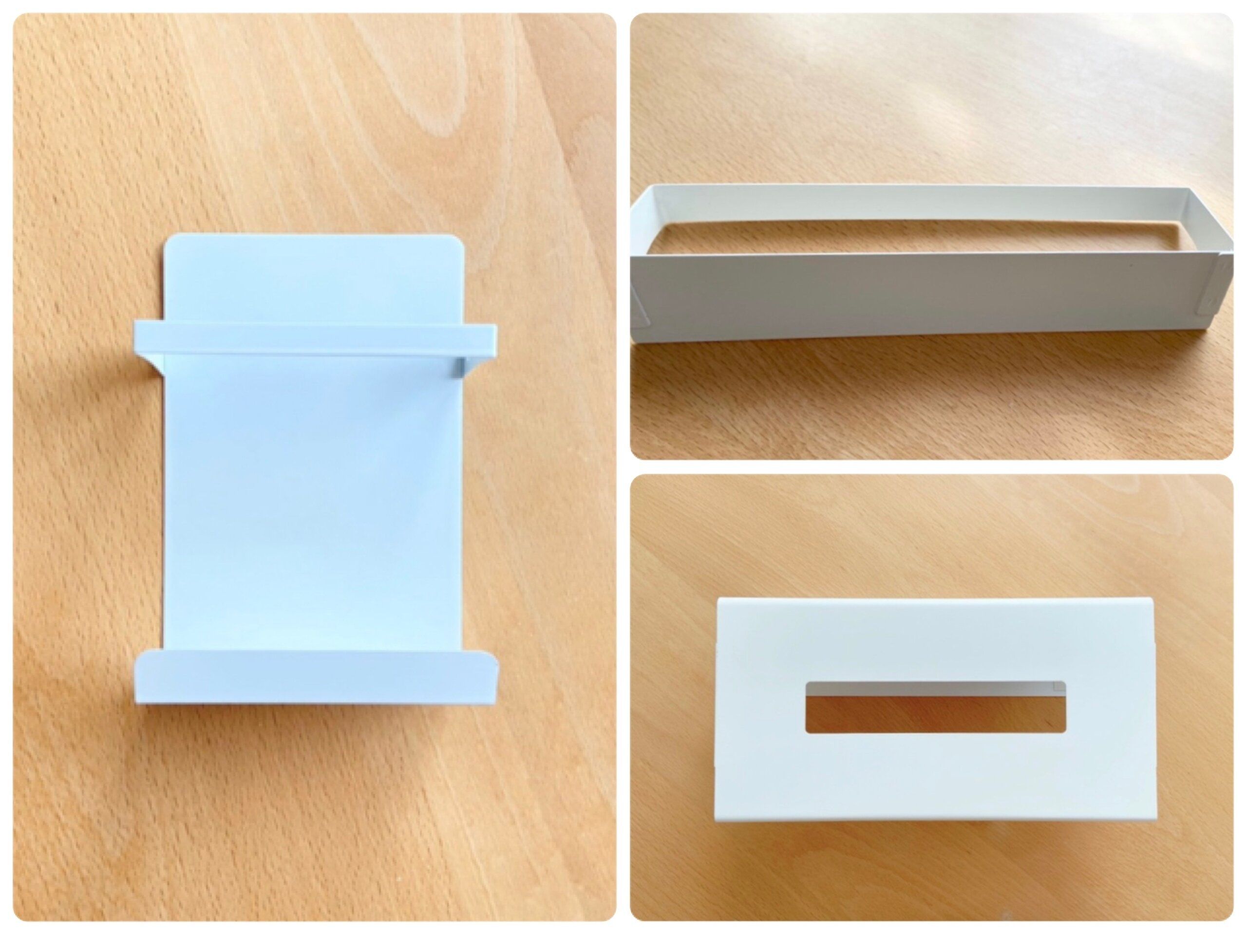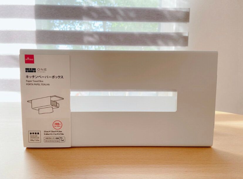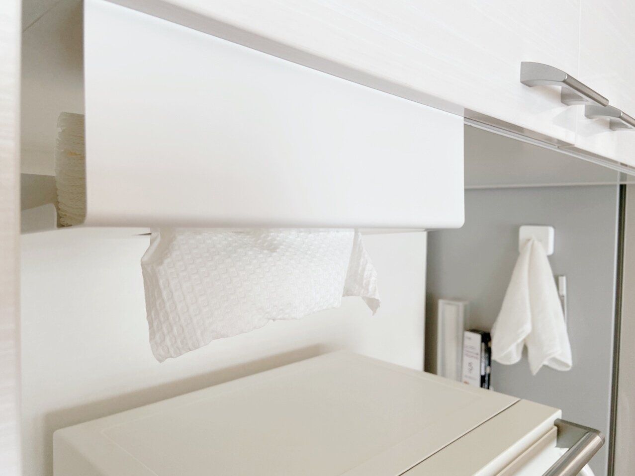 わが家ではスコッティの洗って使えるペーパータオルの収納に使っています。キッチンを使っていて後ろを振り向くとすぐにペーパータオルが取り出せるのでとっても便利。吊り戸棚に馴染んで存在感もあまり気になりません。