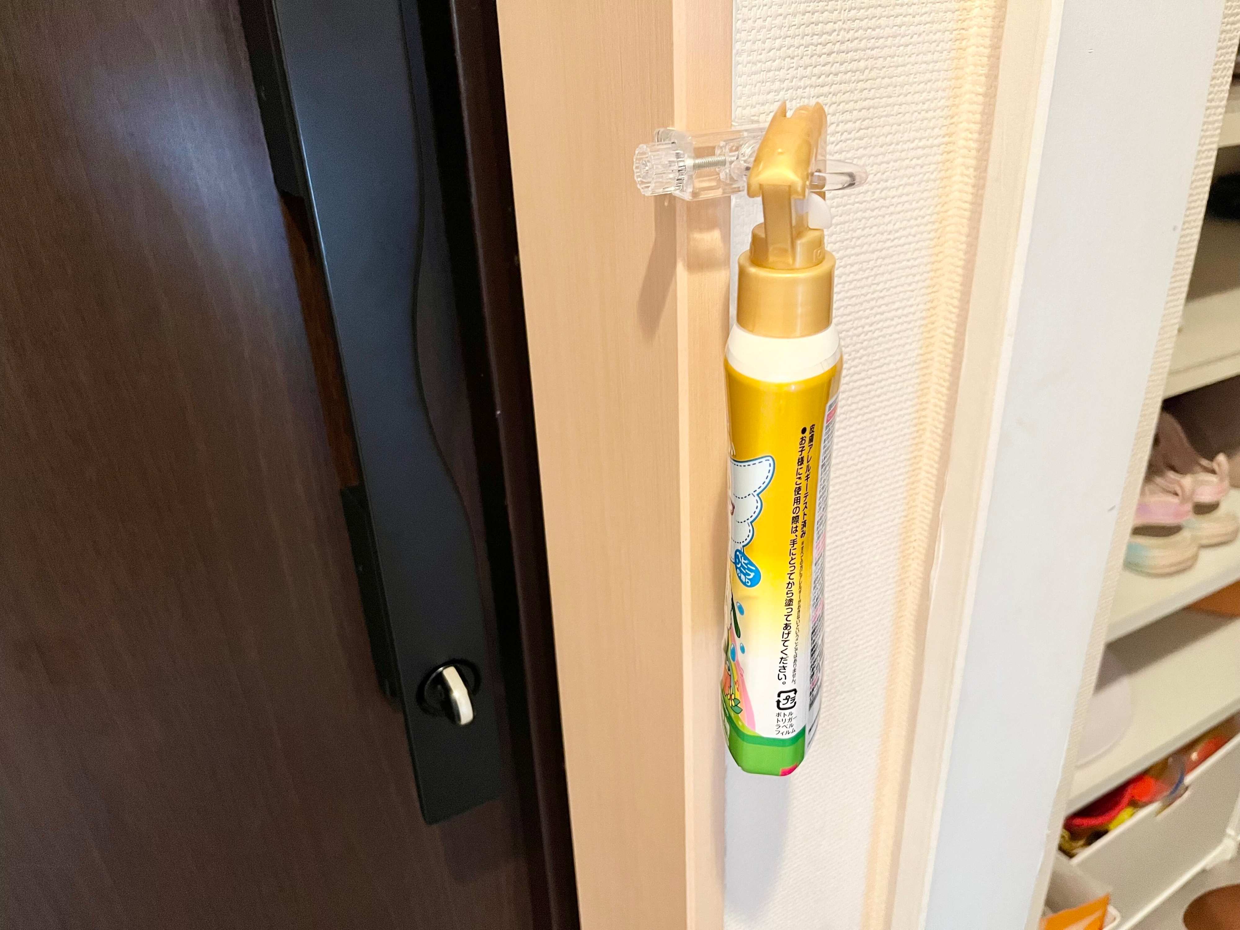 リング自体が360度回転すると先ほどお伝えしましたが、フック本体も縦向きでも横向きでも使える仕様になっています。横向きに取りつければ、玄関先で虫除けスプレーなどのスプレーボトルや、傘なども引っかけることができるので、とっても便利ですよ!