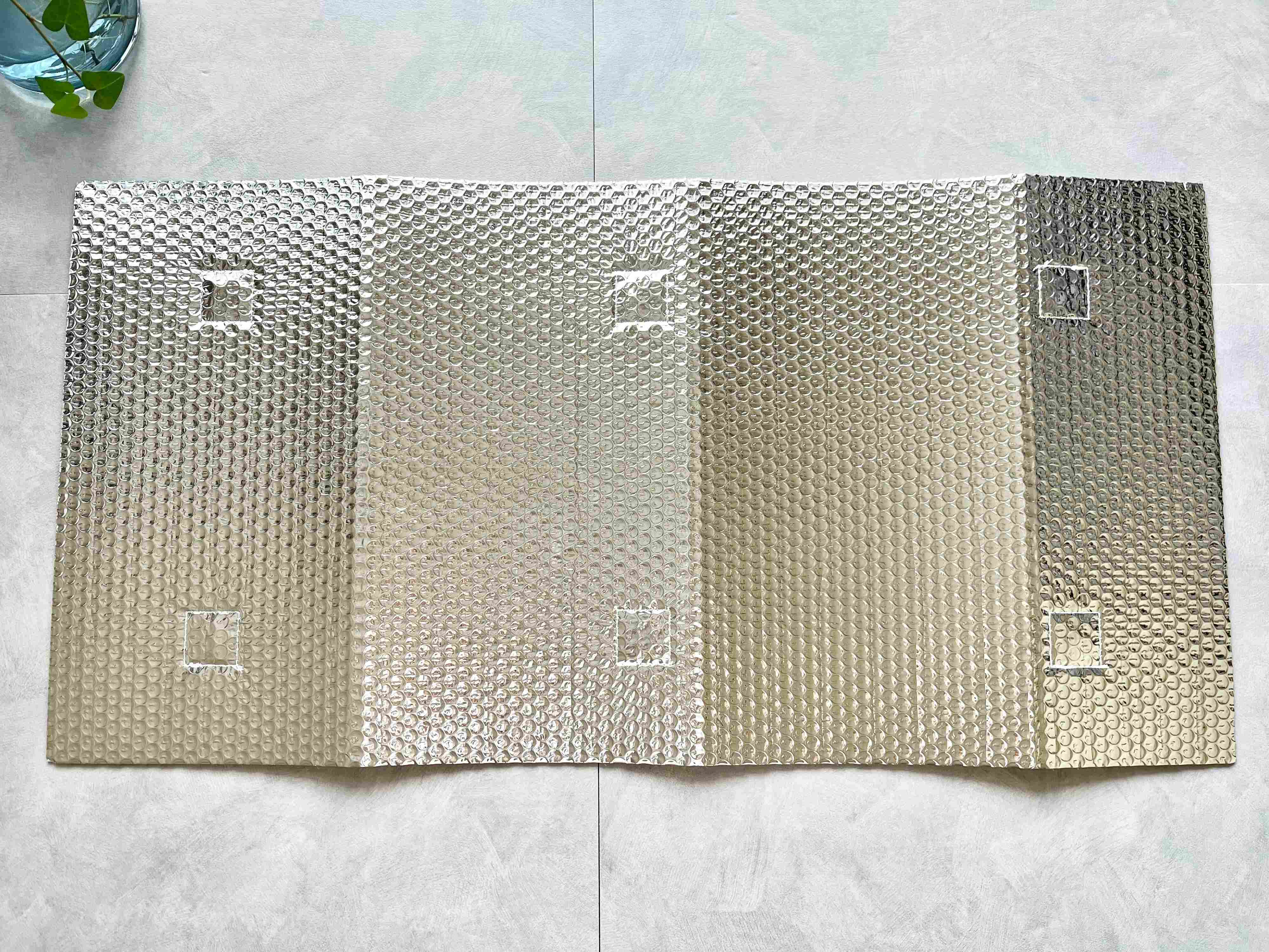 商品サイズは、約縦40cm×横80cm×厚み0.5cm。素材にはレジャーシートなどにもよく使われている、アルミ蒸着フィルムを使用しているので、見た目もまるで小さなレジャーシートのようです。