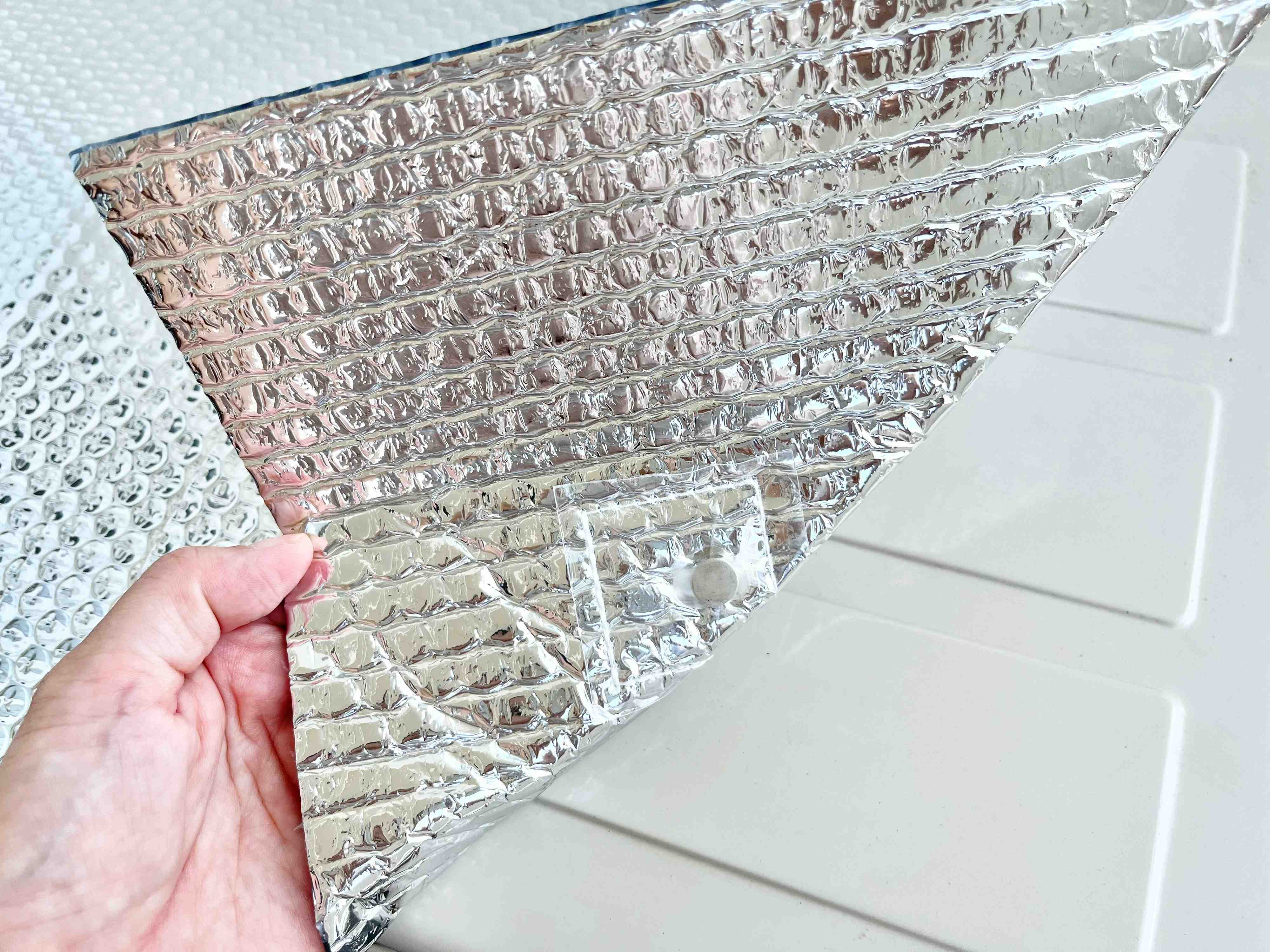 レジャーシートと大きく違う点は、マグネットがついているというところ。1枚に計6個のマグネットがついていて、コレが設置するときにいい仕事をしてくれるんですよ。