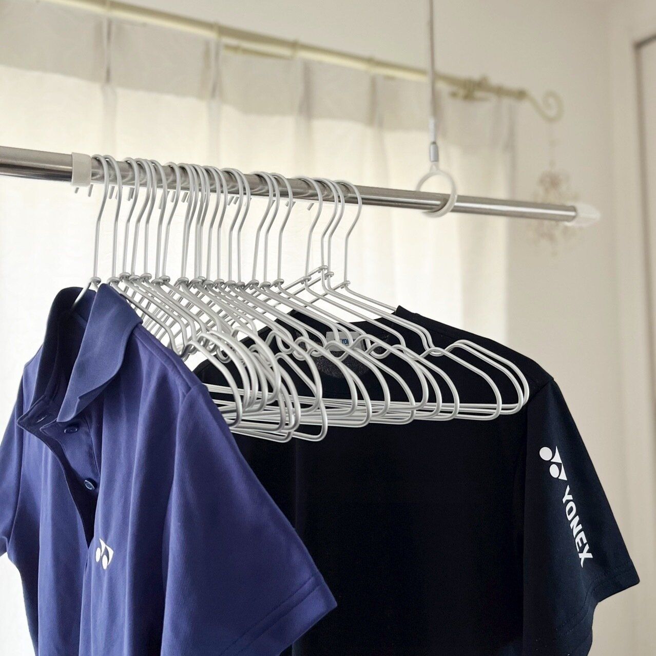 スポーツをするので、普段着に加えてTシャツも多めですが、スリムなので省スペースに大量収納できます。写真のハンガーは20本。幅を取らない事もこの商品の魅力です。