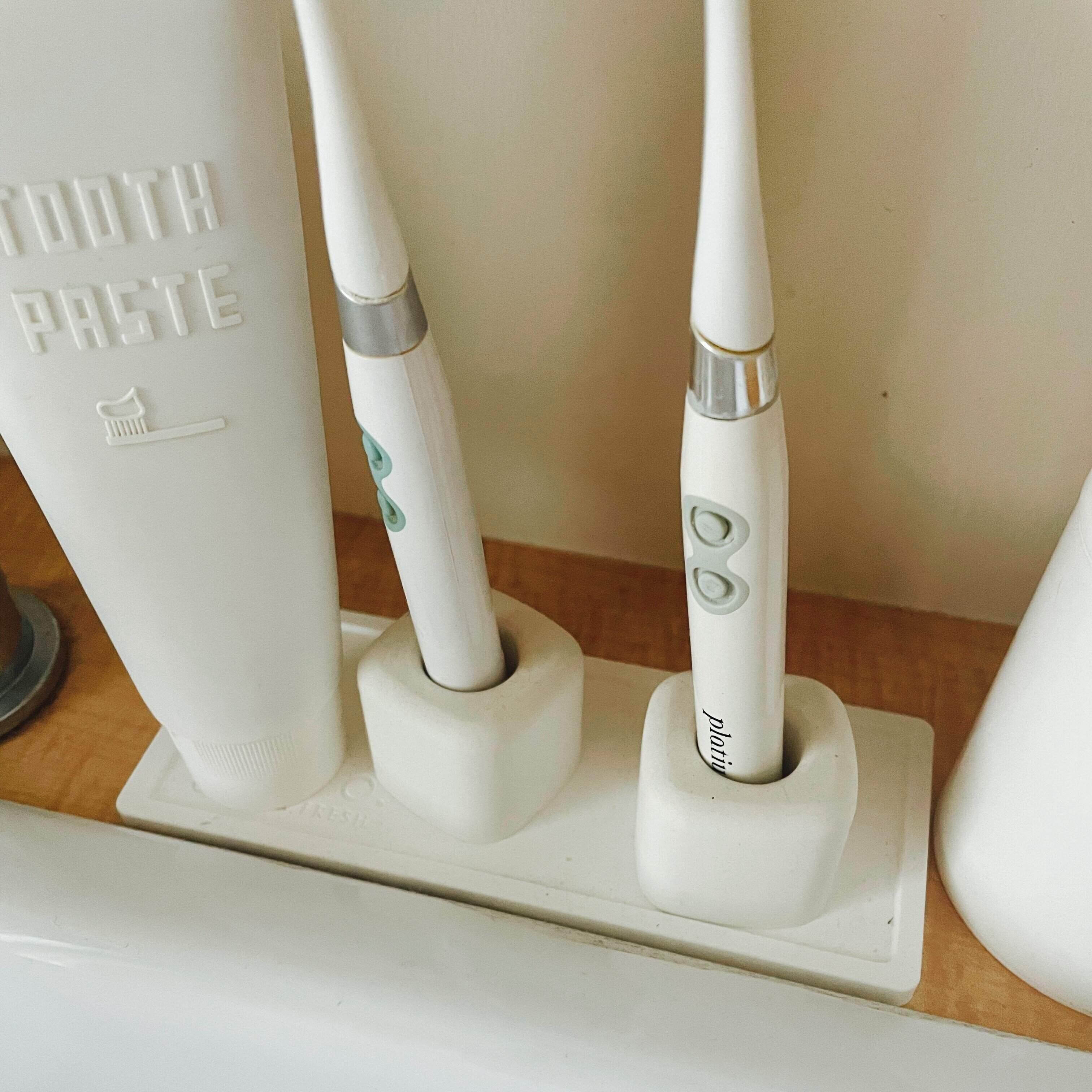 我が家の洗面台の歯ブラシ類は珪藻土トレー上に並べて整理しています。