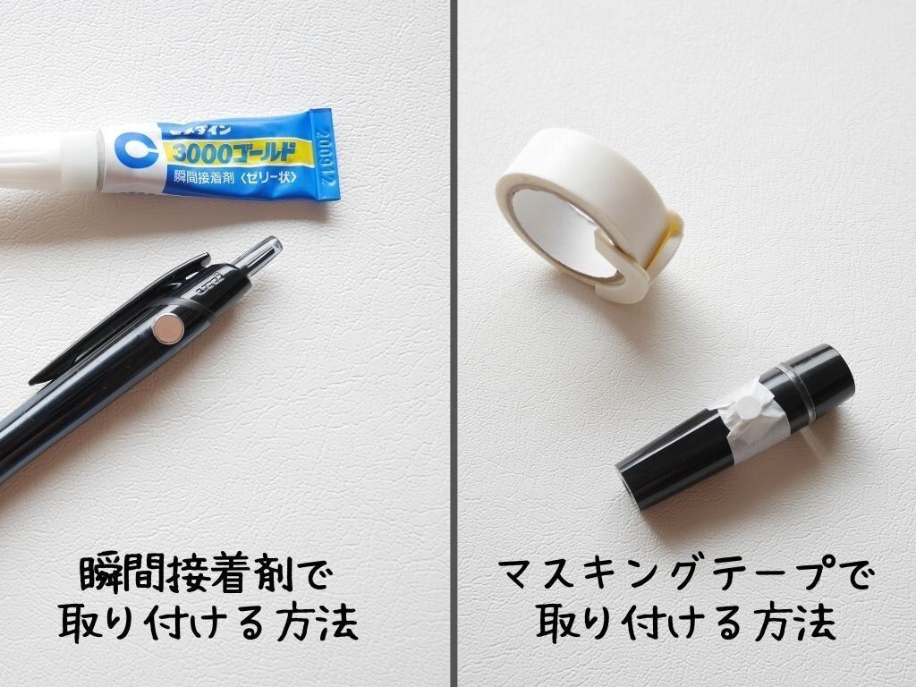 画像のように、小物に「瞬間接着剤でマグネットを取り付ける」もしくは、「マスキングテープを巻きつけてマグネットを取り付ける」だけです。