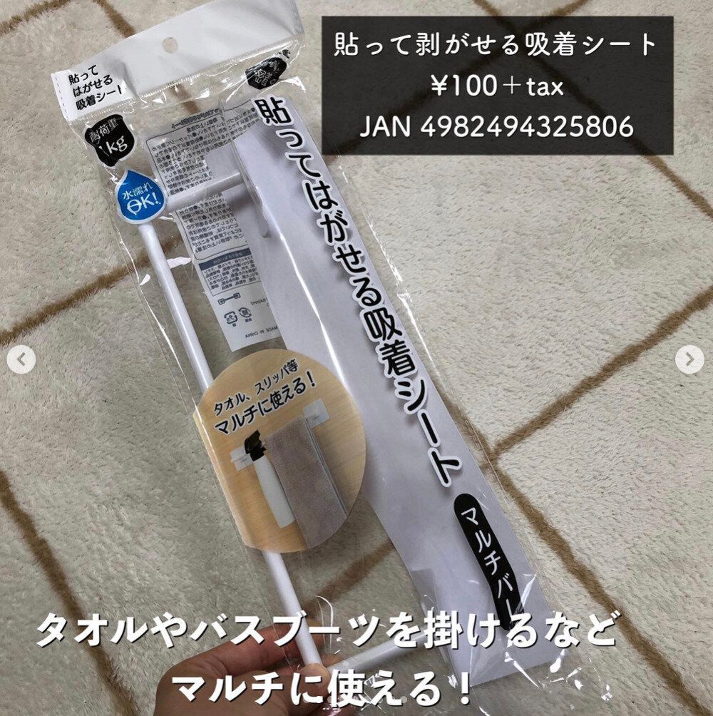 全力でおすすめしたい!タオル、スリッパ、バスブーツなどいろいろなものに使えそうなマルチバー。フックを引っ掛けて使ってもいいかもしれませんね。耐荷重1kgなのも安心です。粘着タイプではなく吸着タイプで水まわりでも使えて、跡残りしにくいです。