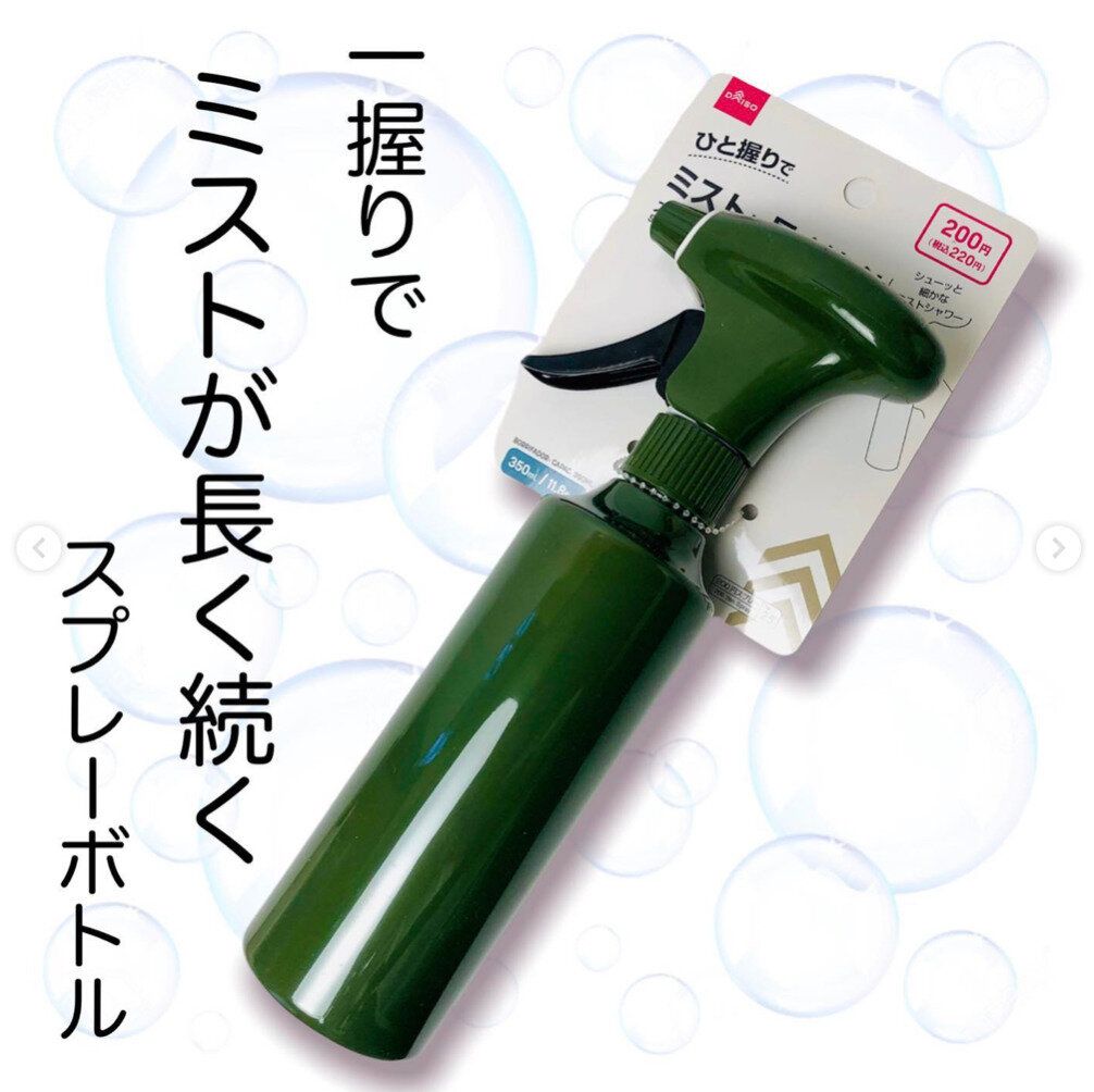 220円で買えるこのスプレーボトルは通常のスプレーボトルよりも高性能。その名の通り「ひと握りでミストが長く続く」んです。しかもミストが細かい!ノズルを回すとまっすぐストレートに噴射することもできます。使い道がたくさんありそうですね!
