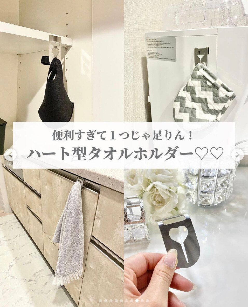 「便利すぎて1つじゃ足りん!」と思わず叫んでしまいたくなるアイテム。かわいいハートの部分にタオルを挟みます。このアイテムのすごいところは、金属が曲げられること。平らなままでも、直角に折り曲げても、U字に折り曲げて壁から浮かせて使ってもOKです。いろんな場所で活躍しそうですね。