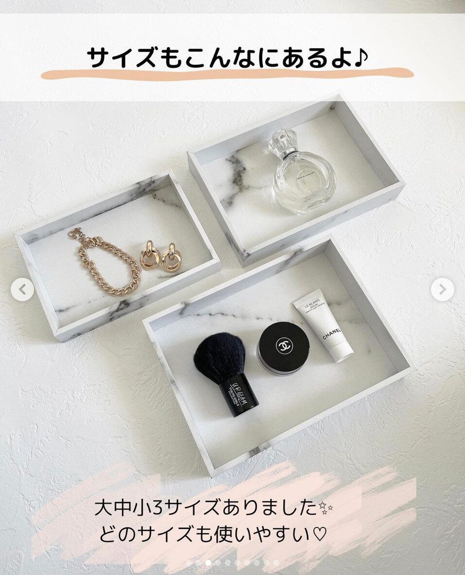 最後にご紹介するのは、モノトーンなインテリアによくなじむ大理石風トレーです。長方型でも少しずつサイズが違い、選べるのがうれしいですね。写真のほかに、六角型、角形などバリエーションも豊富です。コスメやアクセサリーを置いておくのにぴったりですね。素材は軽くて丈夫なMDFです。