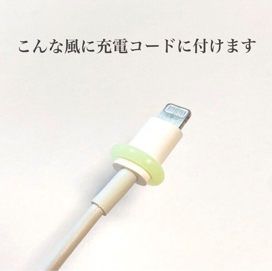 就寝時、充電しようと充電コードを探してもなかなか見つからない…そんな経験ありませんか?こちらの「ペグ用蓄光リング」を充電コードに装着すれば一発で解消です!