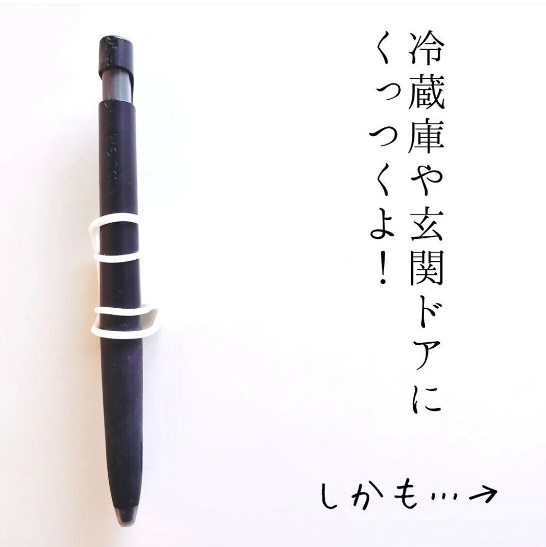リングをボールペンに通すと…ホルダーに磁石が装着されているので、冷蔵庫などにピタッとくっつけておけます。これがあればもうボールペン迷子にはなりません!