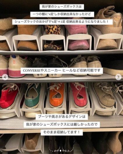 こちらはダイソーのシューズラック。重ねて靴を収納できるので、スペースが限られているシューズボックスの中でも効率よく収納することができます。見た目もすっきりしますね!