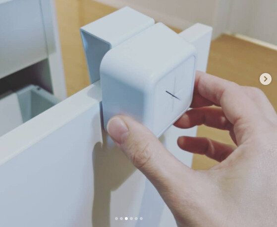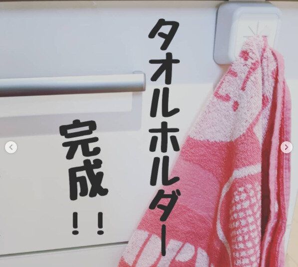 タオルをかけることができる「タオルホルダー」。シンク下の扉に挟むだけで設置できちゃいます。接着剤や両面テープを使わないから、扉に汚れや傷がつくこともありません。
