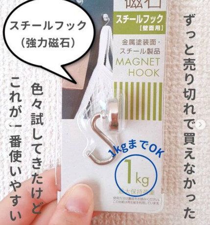 マグネットで取り付けられる「スチールフック」。1kgまでかけることができます。小さなフックなので狭い場所にも取り付け可能。レンジフードや冷蔵庫など、色々なところにも取り付けることができますよ。吊るして見えやすい収納にすれば、ほしいものをすぐに手に取ることができ、とっても便利。