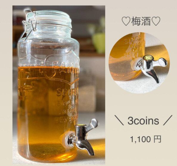 あまりのおしゃれさにSNSで大バズり、爆売れ商品となったのが「2.5Lドリンクサーバー」(1,100円)です。ガラス製のキャニスター風の見た目からして、すでにかわいいですが、ポイントは下部に蛇口がついている点になります。この蛇口のお陰で、本体を傾けることなくすっと注ぐことが可能。いつでもおいしいドリンクが飲めてしまいます。お気に入りのドリンクも、この容器に入れればさらにおいしそうに見える優れものです。