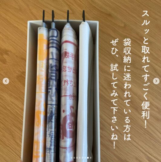 ゴミ袋を種類ごとに分けて引っかければ、便利なゴミ袋収納に。これなら、ゴミ袋を1枚1枚簡単に取り出せて、とっても便利ですね。