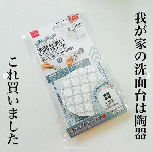 きれいにしたい場所の素材や汚れに合わせて表裏を使い分けられる、ダイソーの「洗面台洗いスポンジ」110円。表の柄のついたほうは、洗面ボウルの陶器などの汚れに、裏の無地のほうは、蛇口の水垢汚れに最適です。洗剤不要で、水だけで汚れを落とせるのもおすすめポイント。