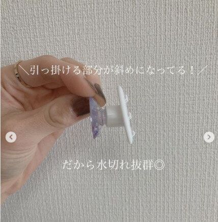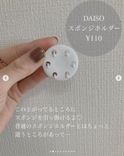 スポンジをシンクや洗面台に引っかけることができる「スポンジホルダー」110円。トゲトゲのところにスポンジをひっかける仕組みです。吸盤でつけるタイプなので、簡単に取りつけ、取り外しが可能。さらに、こちらのスポンジホルダーには素敵な工夫が…。